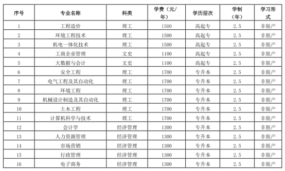 2025年,学校举办专科起点升本科(专升本)和高中起点升专科(高起专)层次非脱产教育,开设招生专业16个,学制均为2.5年。热烈欢迎广大考生